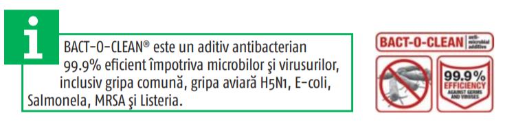 | Proprietati | Aditiv antibacterian BACT-O-CLEAN, 99.9% eficient impotriva microbilor si virusurilor |